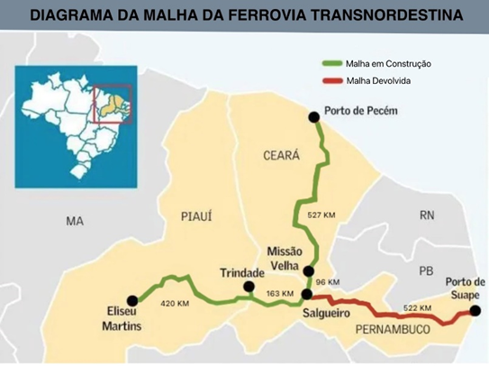 A Ferrovia Transnordestina representa um investimento dá maior importância para o Desenvolvimento do Nordeste, pois além de significar uma reorientação na política setorial do Governo, enfatizando o transporte ferroviário ao invés do rodoviário, significa também, uma integração intrarregional e, a possibilidade efetiva de reduzir o Custo Brasil, pela utilização de portos representativos da região – Suape (PE) e Pecém (CE), criando condições para aumentar a competitividade dos produtos regionais no mercado internacional. O Projeto da Ferrovia Transnordestina foi lançado em 2006, tendo como concessionária a empresa Transnordestina Logística S/A que tem como maior acionista, a Companhia Siderúrgica Nacional, ferrovia essa, que após iniciada, foi paralisada por vários anos, tendo os estudos técnicas voltados a serem analisados, a partir 2021/2022.